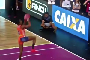 一米八的女生扣篮如此轻松 可见弹跳力绝不一般!